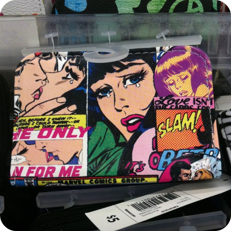 For those of you who shamelessly fawn over the cheesy romance comics of the Golden Age (i.e. Your Humble Narrator), head over to the accessories section of Wal-mart for wallets featuring panels from Marvel’s Romance Comics. The Romance Comics wallets are $6 a pop, and come in two variations (the other is pictured below).