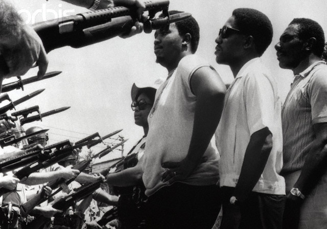 Original caption: 6/12/1968-Prichard, AL: Leaders of a march of about 255 persons stare at police officers who stopped the predominately Negro group from marching on city hall. The officers confront the marchers with ready bayonets.