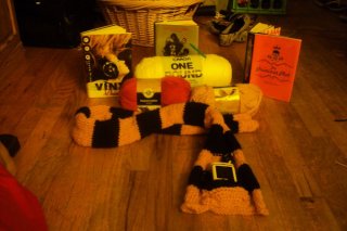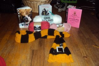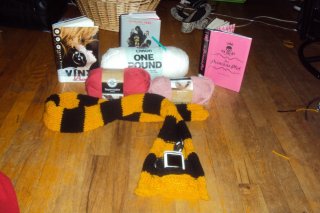 This properly shows the secret pocket I put in Tina’s Scarf. It also shows the colors I chose for shawns Baby blanket which I started on about an hour ago and the books I got from the library.
