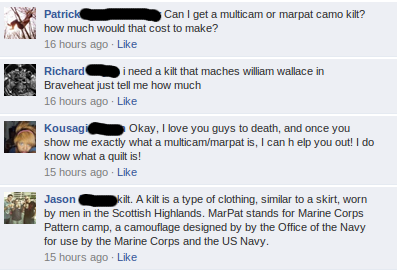 I blog about my little shopping list, and then I have 2 requests for camo kilts?? Idunno but I am really liking this little bit of popularity!!