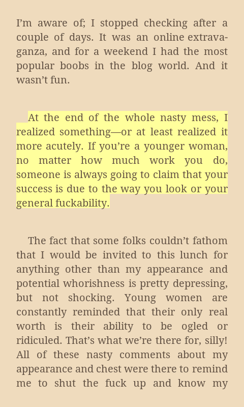 She’s hit the nail on the head here. I remember when quite a scathing blog post was made about me (on a website they admitted to starting up because of me nonetheless,) where they said people only care about what I say because of my ‘fuckability.’ Never mind the actual success I’ve met based on skill or anything. Nope.