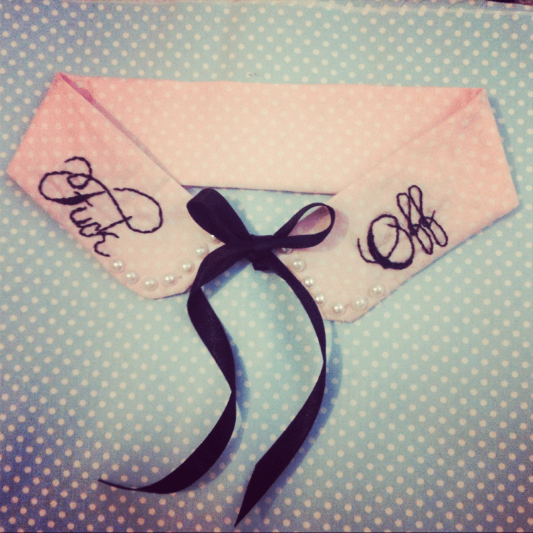 teacuproseblog: The “Fuck Off” collar with pearls and black ribbon tie. need
