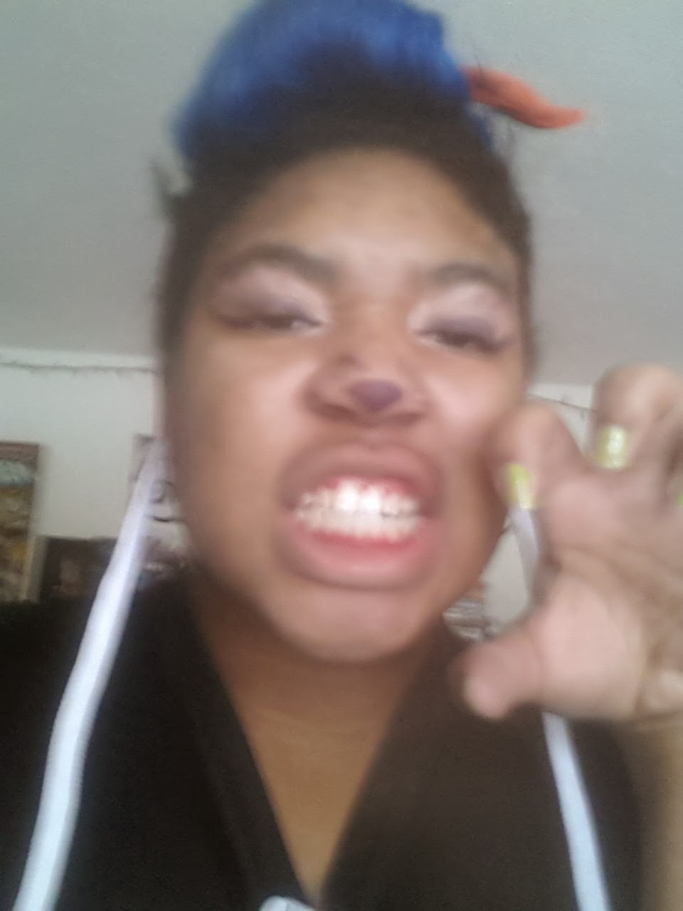 think it was Halloween 2012! So I jumped at a chance to get all catted up for a full day of work, and I mean a full day, 12-8! I’m going to be worn out when I get home. So for my eyes and my nose I used Covergirl Liquilineblast in Purple Passion. For my Orange stripes I used the gold orange in the bright colors palette from Claire’s. I had so much fun creating this look this morning, it was a little disenheartening when I got to work and people asked me whether or not I knew I had makeup on my nose..But I decided I wasn’t going to let that get me down, I was going to enjoy thhe hustle and bustle and I was going to make me some money today!