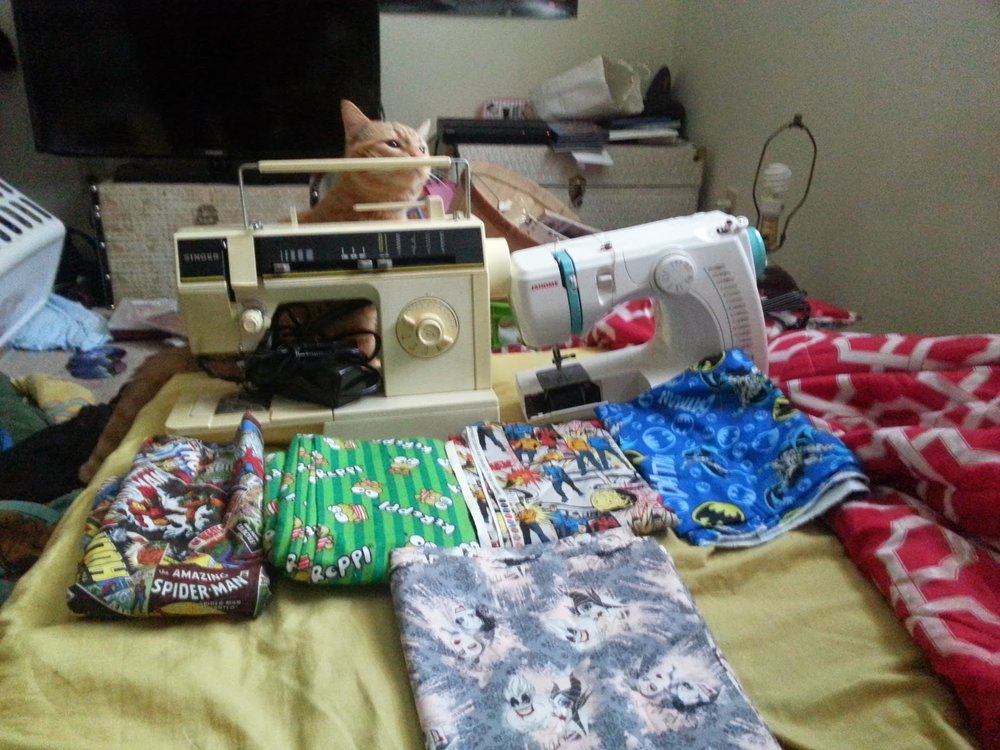 The summer is almost upon us, and with that comes more free time then usual. I have decided to spend mine re-learning how to sew. To give me a good push of motivation in the right direction, i stopped by jo-ann fabrics, who was having a sale on their printed character fabrics, 30% off! I got a little happy and purchased 2 yards each of 5 different fabrics costing me about $60 all together… So until I actually force myself to work with the 3 shelf cabinet that is currently full of fabric i wont be picking anything else up. I figured that i would make a little “tutorial” series out of my sewing experiences this summer, in case there were others like me who wanted to try something different. Heres the fabric i bought and the machines I’ll be working with during this series. A singer machine from the 80’s and a janome machine i bought two years ago that I hadn’t used since, so ill be re stringing and all that good jazz and be showing you guys how to do it as well! I think i’ll bring my youtube back to life with this little project, because my camera should be here shortly. (C’mon! Tax return) I picked up: Keroppi, Disney villians, Star Trek, Batman and Marvel comic covers, I cant wait to start this series guys!!! So if you like sewing, nerdy things, d.i.y.s and learning something new, this is definitely the series for you!