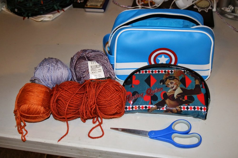 My work bag (As I call it.) is essentially an oversized makeup bag.. It fits four balls of yarn comfortably, a pair of scissors and a smaller makeup pouch, that holds all of my needles. I picked up both bags from Hot Topic. I use both Crochet Needles and Knitting needles for various projects. I prefer to work with Circular needles, just so I don’t have to worry about not enough space, or dropped stitches, they just work so well for me. Plus they are a lot easier to take with you, then straight needles.
