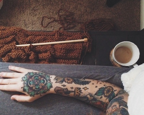 That is some kick ass stitching in her knitting down there! I love tattooed Knitters!!!