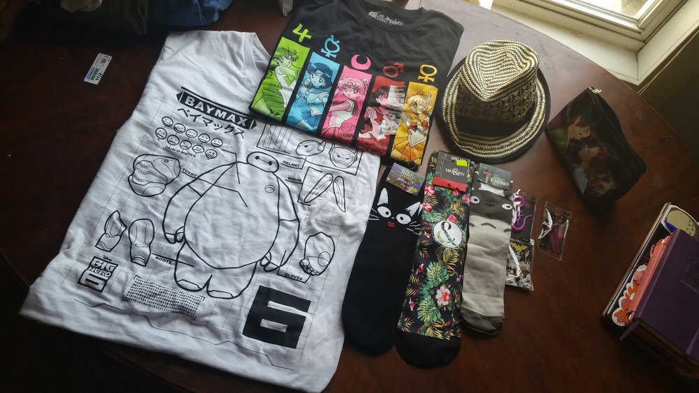 I was also able to stop by Spencers and Hot Topic, after breakfast with Alex’s father. I got earrings, finally able to move up in size. A bamboo hat (I wanted a hat that wasn’t a snapback) a peterpan makeup bag (I’ll be using it for earrings) three pairs of socks, GiGi, Totoro and Mice and Men. (Which now that I’m looking much closer look like marijuana leaves. 😦 Not my kind of thing.) They were having a huge buy one get one 50% off in the entire store, so of course I had to grab some t-shirts! I picked up Sailor Moon and Baymax. I love the Baymax one because it looks like blue prints for his flying suit.