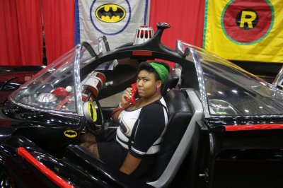 My number one priority of course, was to get my photo taken with Adam West and Burt Ward. I was able to do that. I was worried after, getting my ticket, that I would be really far back in line, so we explored for another hour and then headed in line. While exploring, I realized they had three of the 66′ Batman vehicles: The Batmobile, Motorcylce, and the Helicopter, actually from the movie, it was full of autographs from the original cast! They even had the bomb you guys!! So of course, I had to take some awesome pictures with that!!!