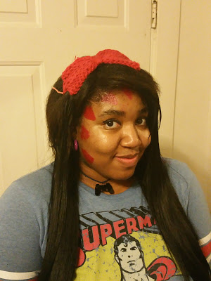 Today I was Peppermint Butler, it didn’t go over very well. Mostly because I don’t think people watch Adventure Time where I work. No one seemed to know who I was supposed to be, and then the other half didn’t really ask at all. They probably just thought I was really weird. Over all I liked it, and that’s all that matters right? I changed the red bowtie instead to put in my hair and I think it looked better and more girly that way. I made the triangles on the side of my face with red lipstick and they stayed pretty darn well. A little too well. My face is a little red from all the scrubbing,