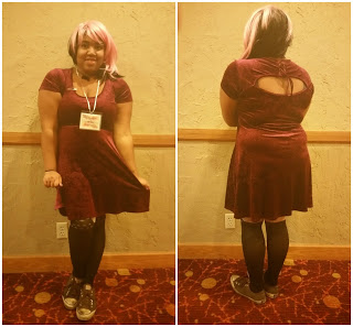 That’s why I’m so mobile, Why my mini has a keyboard, because I don’t have enough time at home to do what I need to get done, it has to come along with me! I stopped into Hot Topic and got this super pretty Burgundy Filigree Skull Velvet Dress, and it had an oval keyhole in the back, as soon as I saw it, I was like this is it! Then I picked up a few pairs of earrings, and some Totoro Tights, and then I was off, looking for the perfect heels for the event.