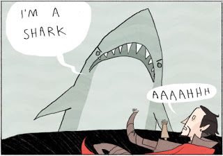 This story is much darker than lumberjanes but contains that same type of humor, if that makes sense? I feel like every person can find a bit of themselves in this story, and that is what makes it a classic. These pictures are just a few of my absolutely favorite parts of the story. When she morphs into Blackheart and mimics his love for science, makes me giggle so hard. Sometimes I tease Alex about his second love “Science”, I wish I could pull this trick on him. I’m sure I’d find it funny. Nimona used her ability just like any person would. If I could be a shapeshifter, I can’t guarantee that I would be able to stay on the straight and narrow…No one would know it was me, think of all the possibilities?! Plus you could pop up on people not expecting you as a shark, think of the shock value!!