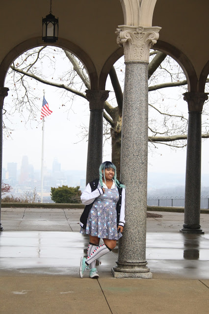 Outfit Details: Hoodie: Pokemon Champion from Hot Topic// Collared Top from Walmart// Alice in Wonderland Dress from Hot Topic (a Favorite)// Knee-Hi Socks from Hot Topic// Teal Converse from Burlington Coat Factory.