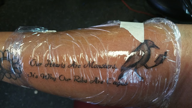 Easter Weekend, I walked into my fave shop, Artis Inks, and sat down for my appointment. This tattoo is the biggest one. By like 8 times. At first I was pretty nervous about getting it done, but now that it’s here, I am so in love with it. Especially when I take outstretched selfies, because you can see the whole thing in my picture. The tattoo is a quote by Elalusz, “Our hearts are Monsters, it’s why our ribs are cages” and then for Edgar Alan Poe, I got a raven with a red eye, reading a book. So technically it’s two tattoos in one, which makes me feel a little bit better about how ginormous it is.