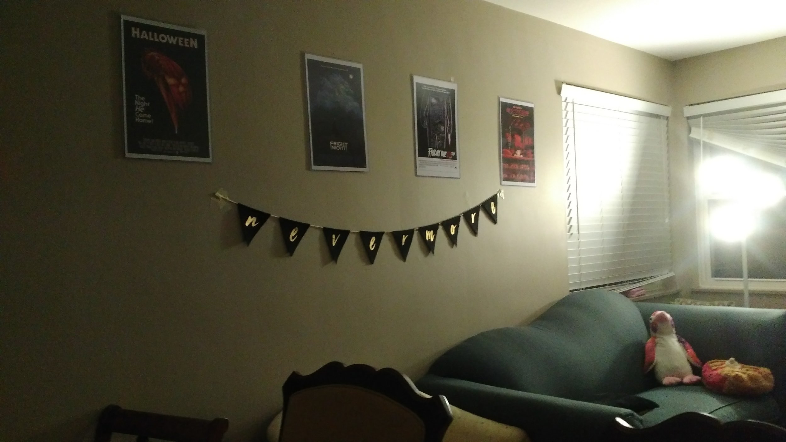 Michaels is an amazing place. They literally have something for every hobby you could possibly think of. When they sent me three different coupons for Halloween decor, how could I say no? So counting everything, I grabbed four different types of lights, 4-yard stakes in shapes of ghosts, bats, and skulls, A ghostly radio with different spooky channels, two skulls, one black velvet and one black plastic. A Nevermore Pendant banner, A small bird cage, a glass filligree frame that says Enter if you dare, and a beware plaque.