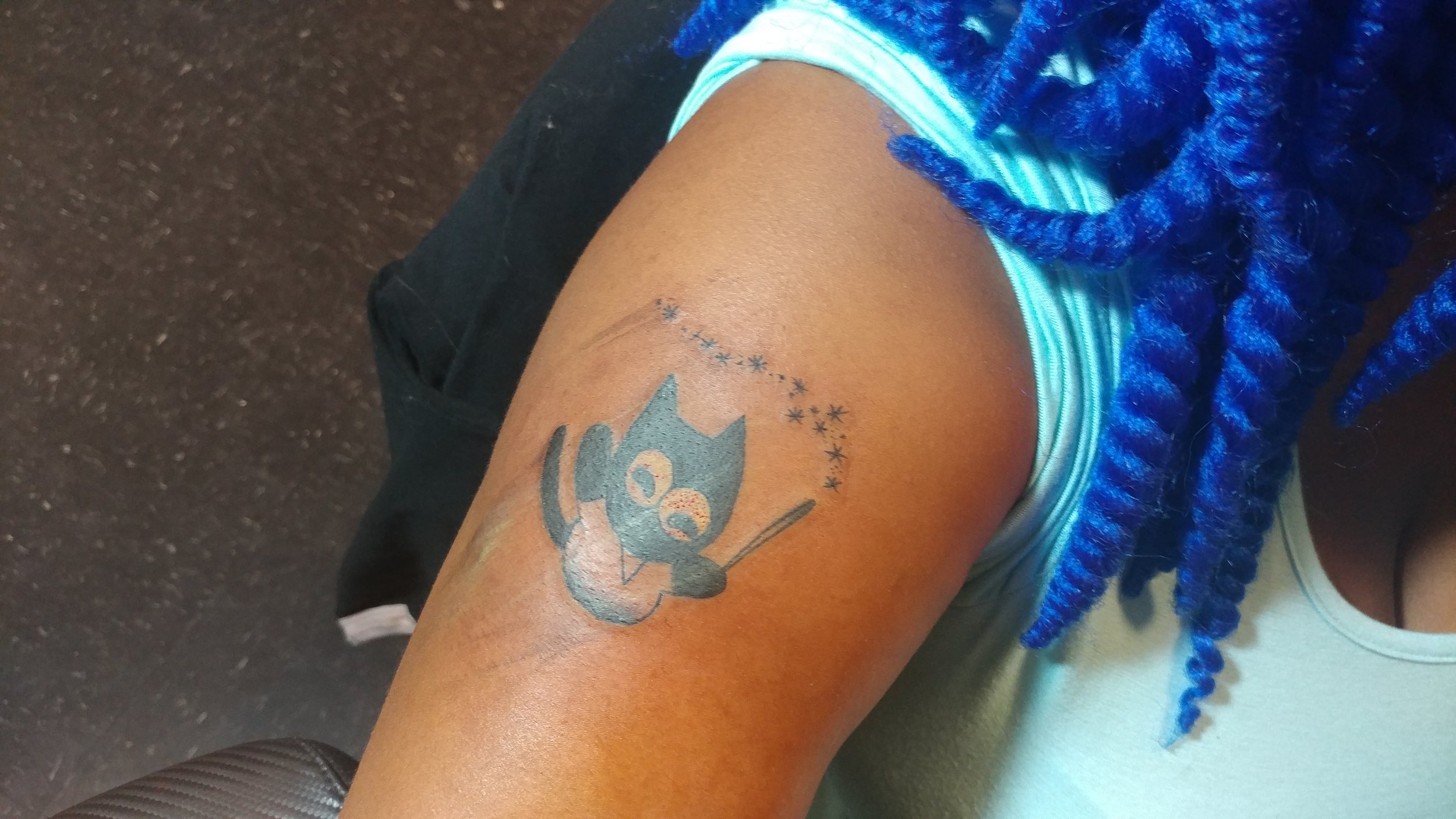 Momo the tattoo was born! It’s actually a double because Geronimo Sama’s nickname is Momo, so it still works out! I have her doing a bit of magic, with her wand, and in her wizard tunic. It’s so tiny, but it bled SO MUCH! I think because it was a pretty fleshy area. I also got her eyes colored in, I’m working on trying to include more and more color into my tattoos.