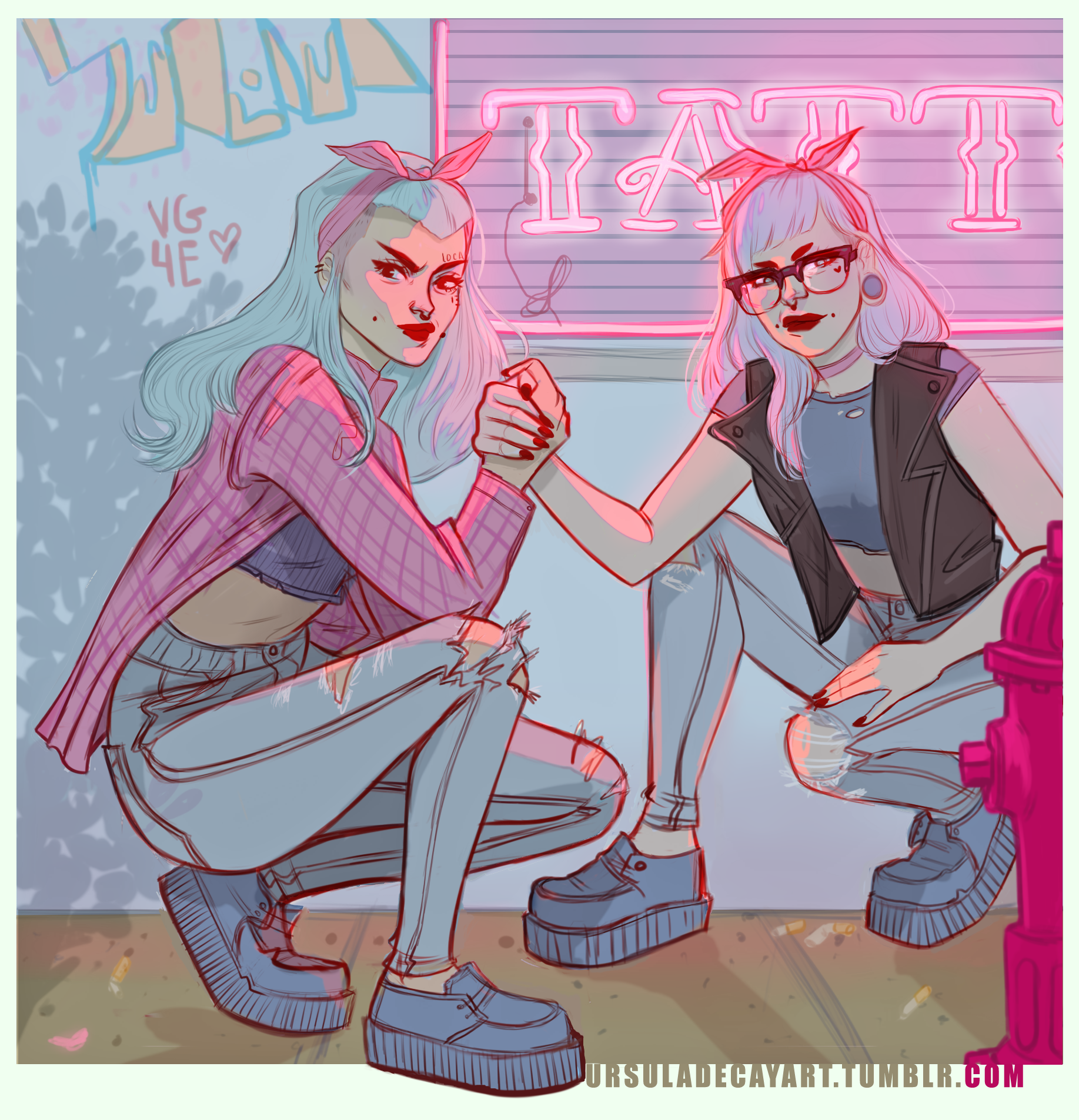 UD: I am heavily influenced by the color palettes of the 80’s and 90’s. Lots of either pastel colors or really grungey colors. I grew up with a lot of stuff from older cousins: JEM, Care Bears, She-Ra, Rainbow Bright, 80’s Barbies. So that really had an impact on my art. I never got to have the “anime phase” haha I had an old cartoons phase and copying ads from old fashion magazines and that kind of grew into what I have now: a not realistic but cartoony with real-ish proportion with a little bit of comic book-y ness and a lot of fashion influence, I’m making up words.
