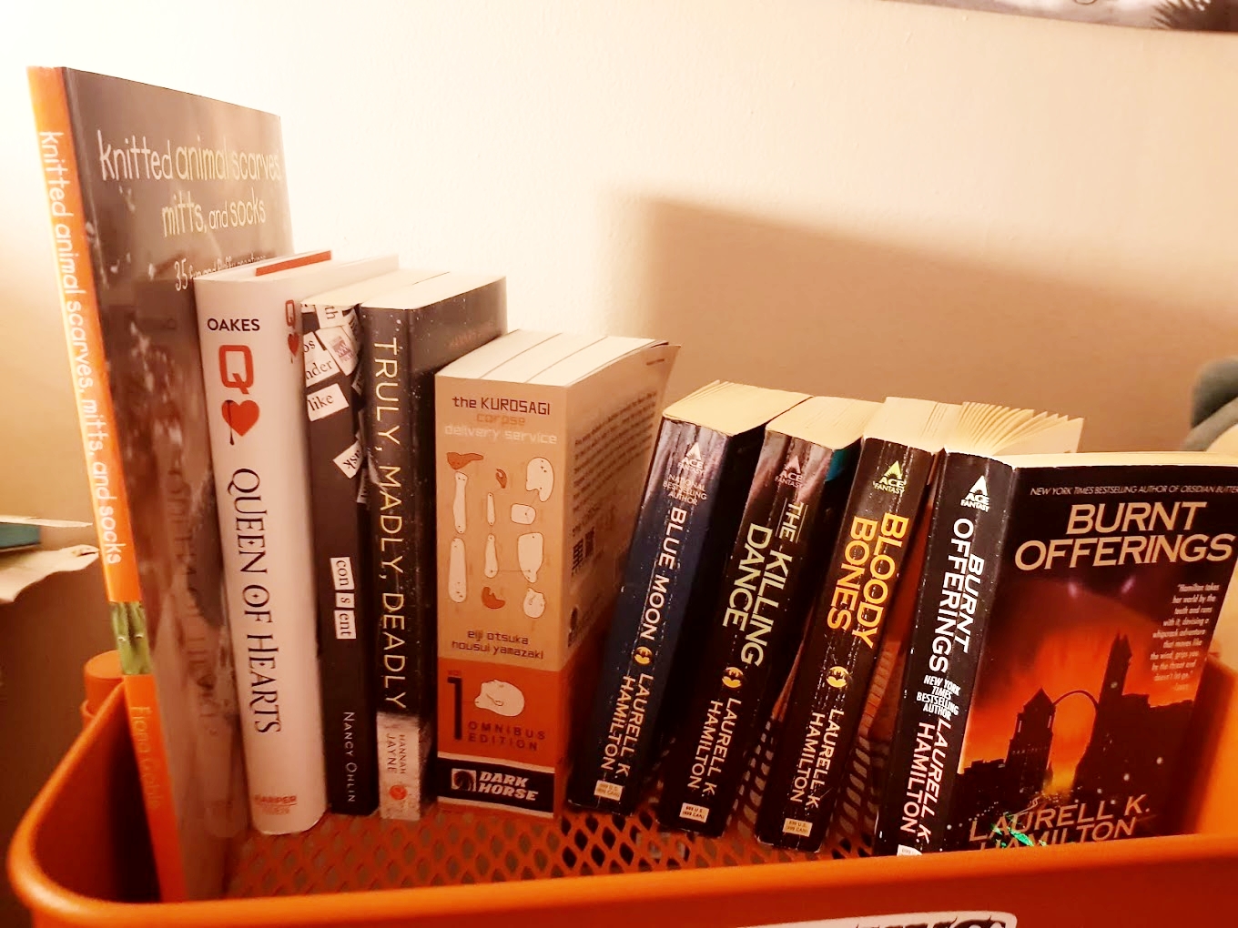 Since taking this picture, I have completed Truly, Madly, Deadly, and Consent. I’ve decided that the writing in Queen of Hearts isn’t for me. I’ve just started actually following the pattern for the Bear Scoodie, in Knitted Animal scarves, mitts and socks. The Four small paperbacks are the continuation of the Anita Blake Series, they were a steal, I couldn’t pass them up. So I have the first 8 now, and I’m still working on finishing the first one.
