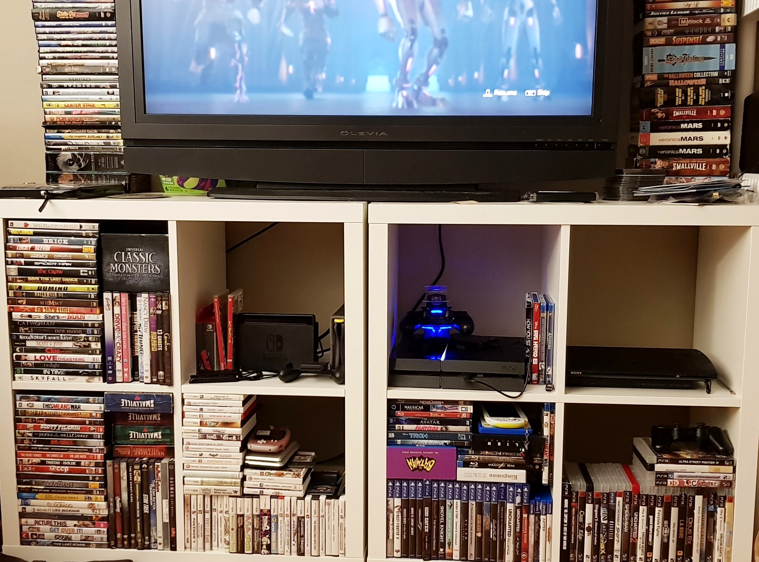 Boy Wonder finally got around to building the shelving units I bought from Ikea. We didn’t think they would be wide enough to hold the tv, so I bought two, but they totally were, so they took up practically the entire wall, and we still need to buy more because there isn’t enough room for all of our DVDs. *sigh*