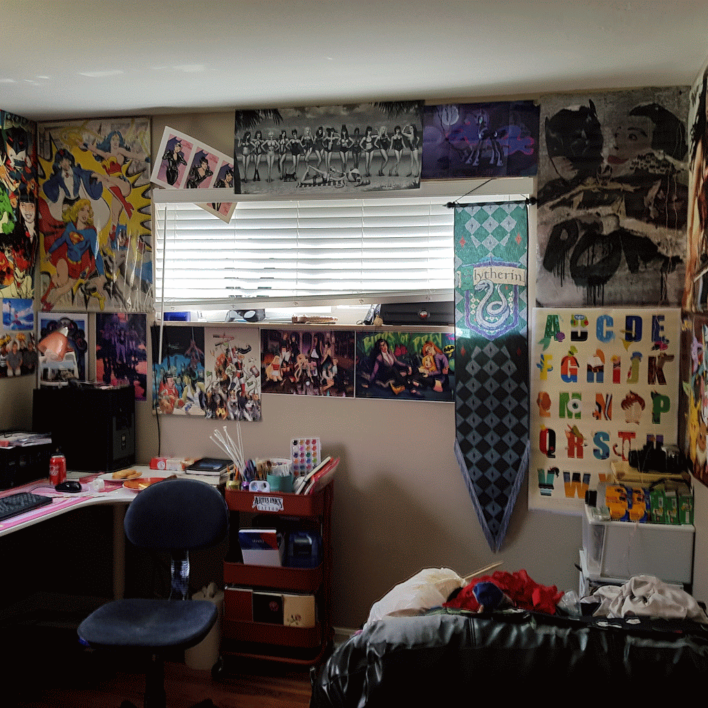 I started watching Furry Little Peach’s first Studio Tour again, I think it might be my favorite video of hers. Every time I watch it I just get so inspired! Unfortunately for me, I started watching it at about 2 am, so I spent the next four hours remodeling my studio. Moving Furniture, and reorganizing my bookshelf which was really fun.