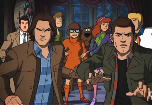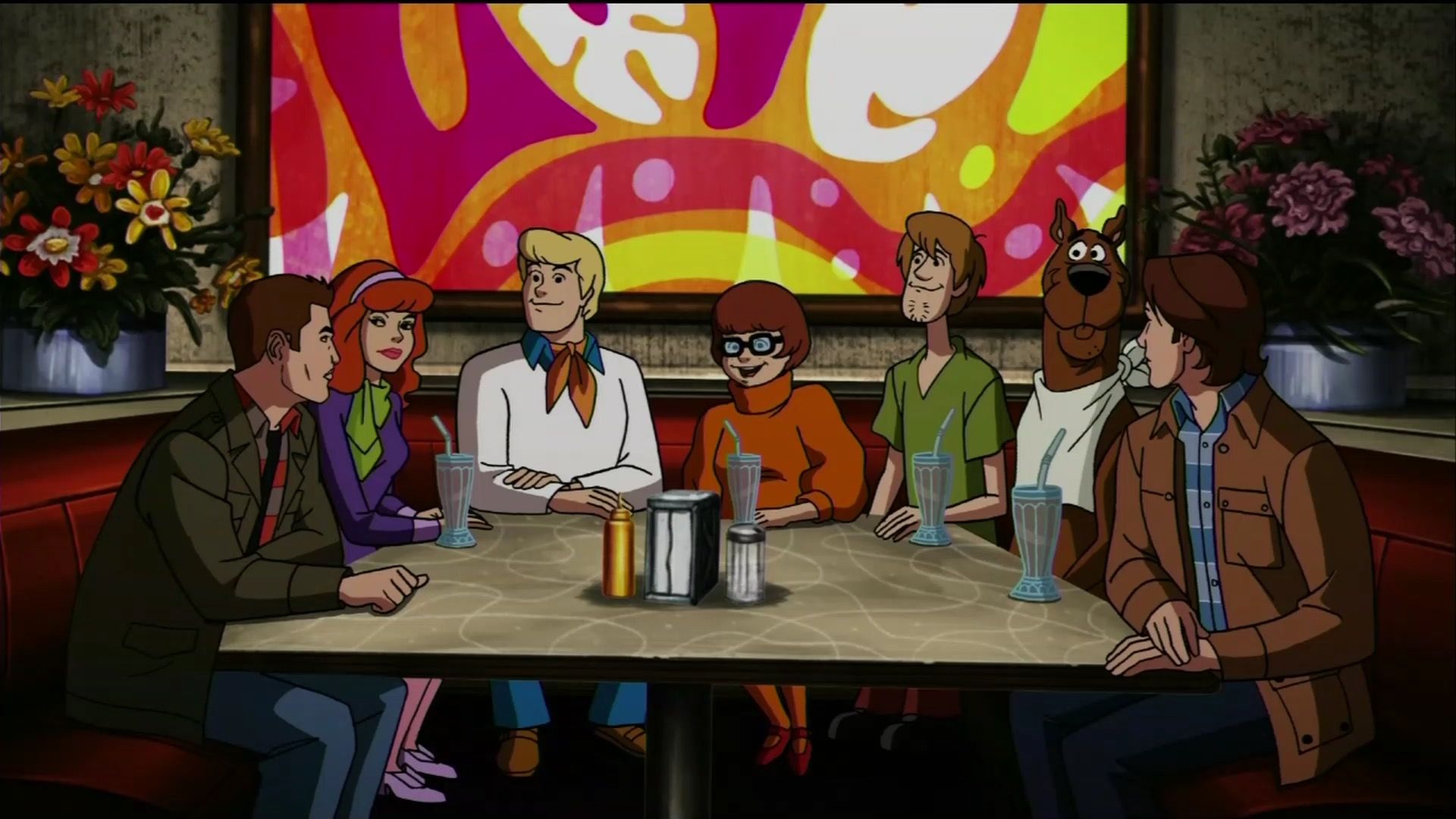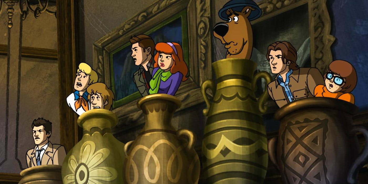 After Dean has an absolute Fangirl moment, the team agrees to let the brothers tag along as they enter Sanders Mansion, because they have to spend the night in order to get money from his will. The crossover follows the cartoon episode “ A Night of Fright is No Delight.”