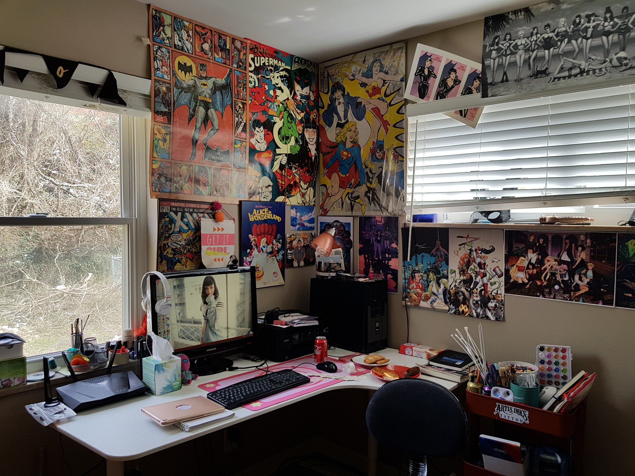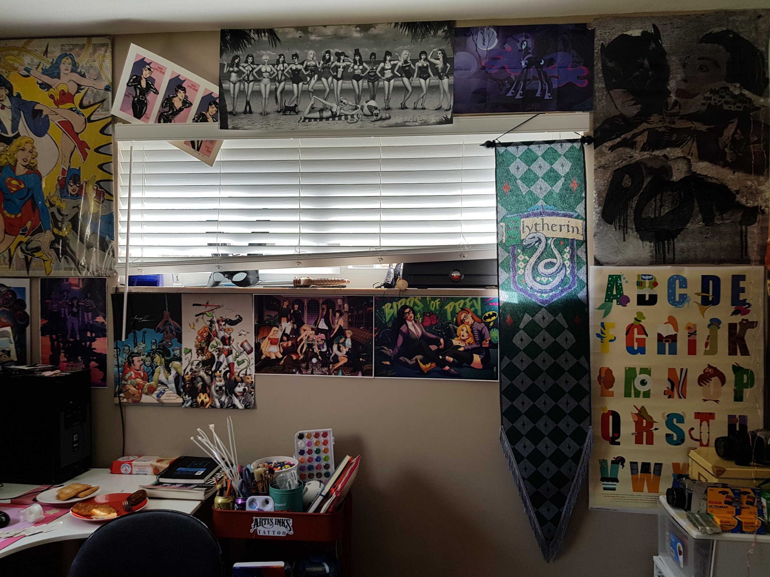 I’ve seen a lot of studio with clear walls and beautiful shelves, and while I love the look of it, I don’t think I could give up my posters. There’s just something about looking up from my desk and seeing fictional characters that inspire me, or beautiful artwork that motivates me to draw more, film a YouTube video, or write another blog post.