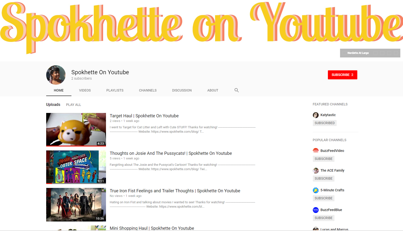 Finished the Old Youtube Backlog: I didn’t want to be Nerdette Minute anymore, and 68 videos later, I was completely rebranded. I edited each video and re-uploaded them, and now that I’m finally finished I can start filming new content and I’m so so excited about it.