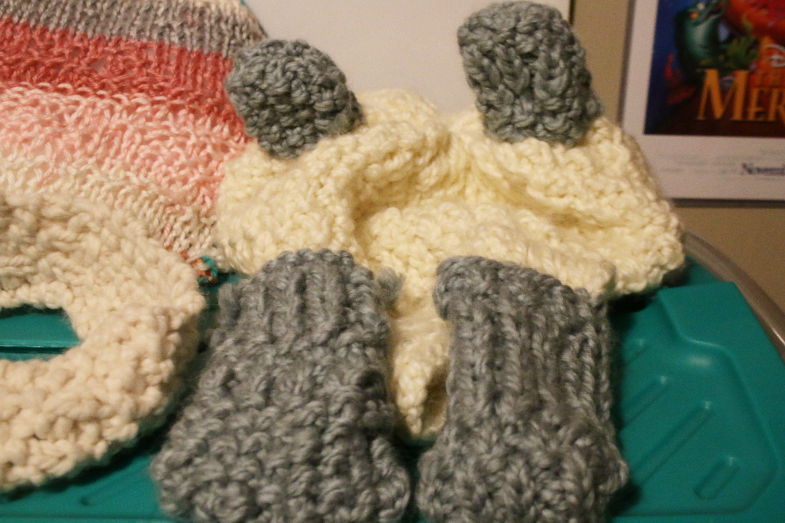 I wanted to start being able to read and understand knitting patterns, so this hat/scarf combination, called a Scoodie was a perfect starting project. I realized later, that the hat would stretch so if I had stitched on the seam like the pattern said instead of doing the hat twice, it would fit a lot better, but it was my very first finished project, so you live and you learn I suppose. I got this pattern from Knitted Animal scarves, Mitts and Socks by Fiona Gable.