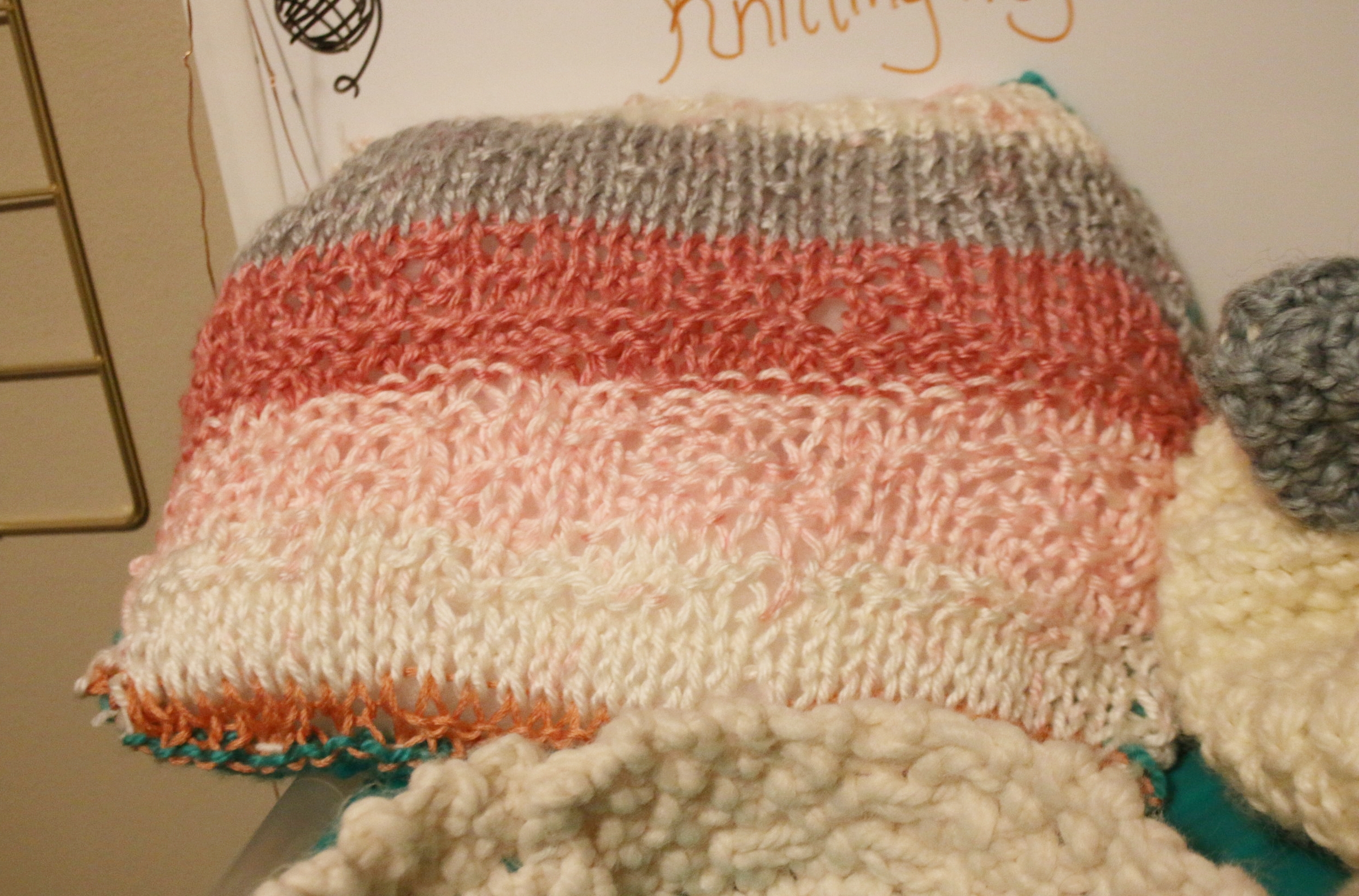 I have three projects to show! I’ve really started to fall in love with making pillows, they’re super simple, and its the perfect way for me to test different types of stitches, I make it long, fold it over, stuff it and stitch it closed. It’s also a great way for me to work through my yarn as well! I was working on the last half of a ball of these particular colors, and thought they would look great together as a pillow.