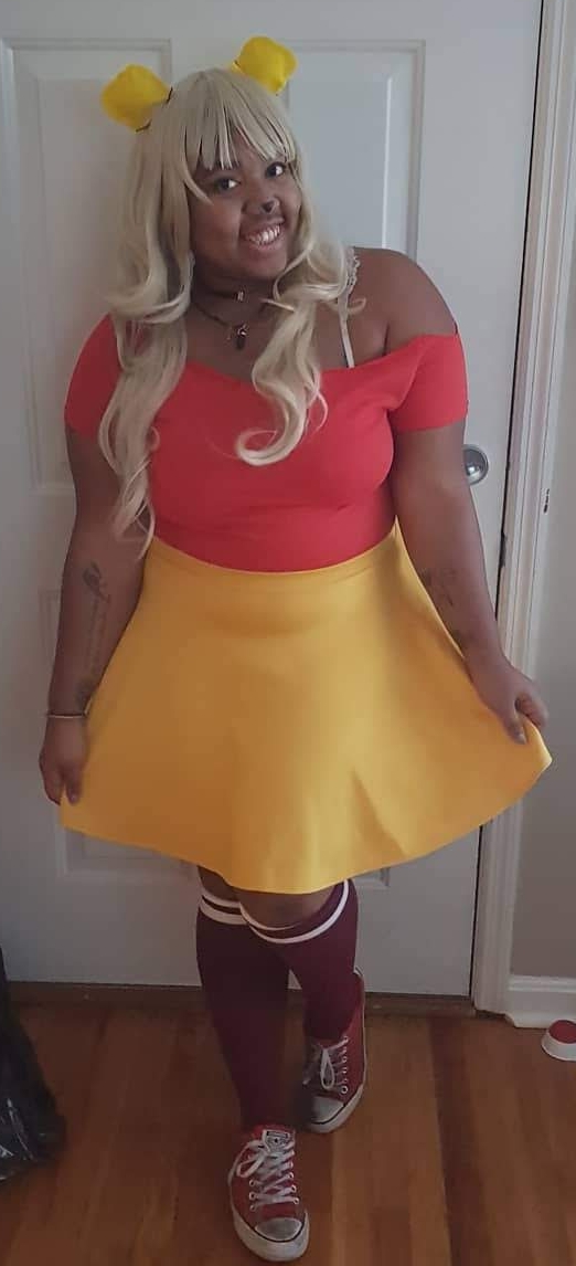 Winnie The Pooh: I literally woke up Saturday morning and was like… I COULD BE WINNIE THE POOH! So at 9 am I headed out to my nearest Michael’s to pick up a red t-shirt because I don’t actually own one, and yellow felt for his ears. I cut the collar off the t- shirt because I really enjoy off the shoulder looks, I paired it with Red varsity socks, and a yellow skirt I already owned.
