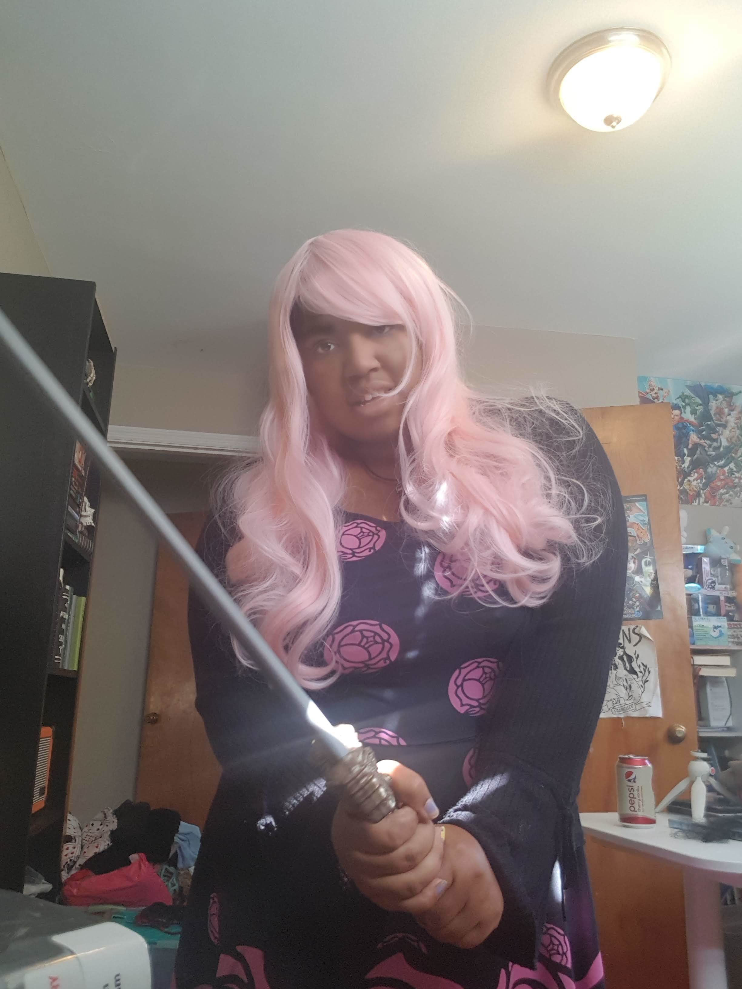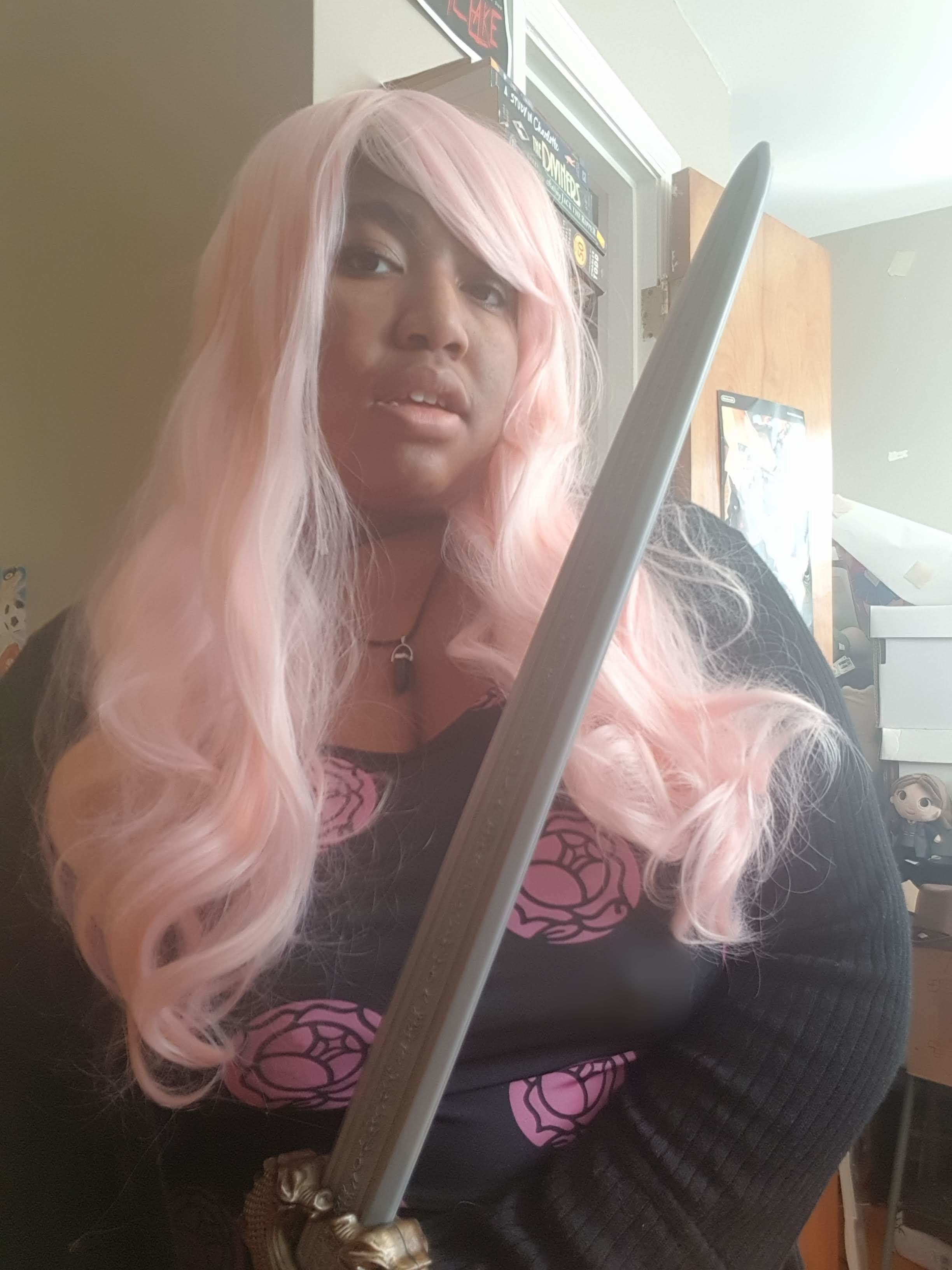 Utena Tendou: I came across the dress on etsy and had to have it, and then when I was putting together costumes for work, the idea to do something Utena-adjacent popped into my head and I could’t Let it go. It’s not necessarily her full look because she’s always wearing shorts and her school uniform and that was something I couldn’t get away with at work, but I was pretty proud of my attempt. It’s a cotton candy wig, I actually purchased for an Anne Wheeler costume that I never put together, and the god killer sword I got from Walmart. None of the people I saw during the day recognized who I was supposed to be. I think I get hipster points for being an anime character no one recognizes right?