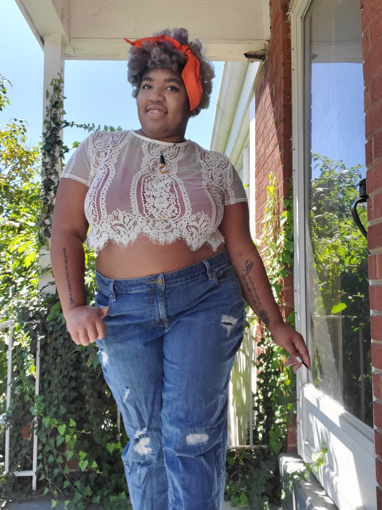 Next up is Fred, Now since this isnt the first time I’ve ever dressed as a femminine Fred, I knew I had this one in the bag. I used a lace See through Crop top, from amazon, a pair of boyfriend jeans from my mother, that she more than likely got from Lane Bryant, and an orange ascot I actually bought for the other costume, and wore it in my hair. The end results in something that is super feminine and super 60’s , with a hint of modern. It’s tied with Daphne for my favorite look.