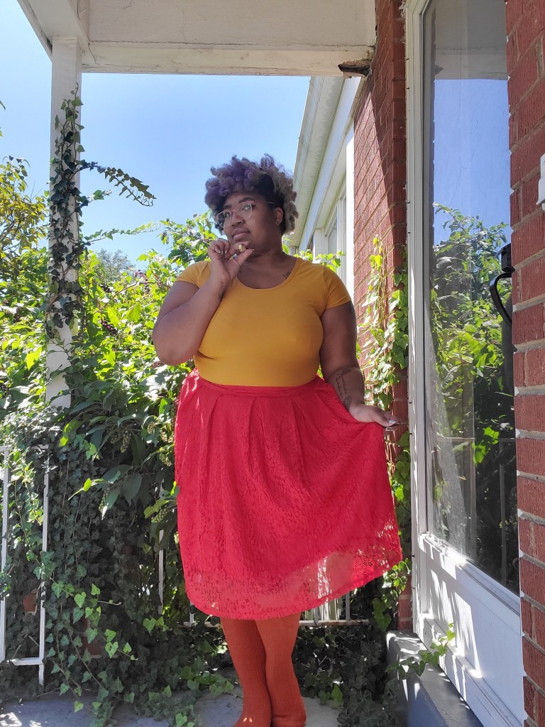 Velma, I feel like is the most recognized of all the outfits. With a yellow top from Target, and a red skirt I picked up from Amazon, which comes with pockets! I wore orange socks, from Target, to pull together the look and finished it up with my blue filter glasses.